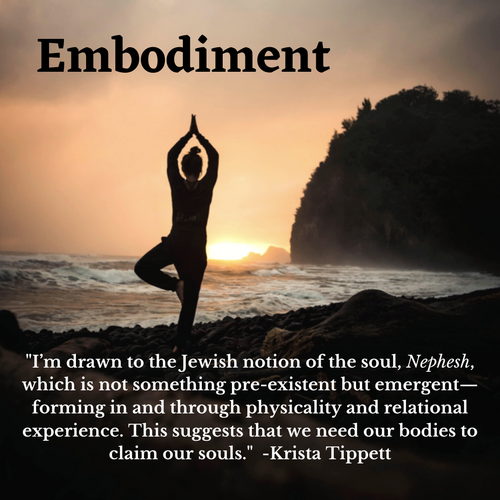 Quote: "I'm drawn to the Jewish notion of the soul, Nephesh, which is not something pre-existent but emergent--forming in and through physicality and relational experience. This suggests that we need our bodies to claim our souls." - Krista Tippett
